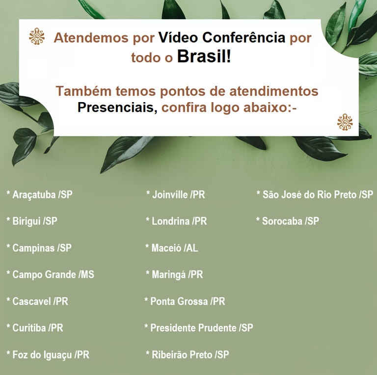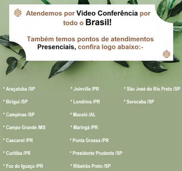 Atendimento por todo o Brasil por vídeo conferência e também temos pontos de atendimentos presenciais verifique logo abaixo.